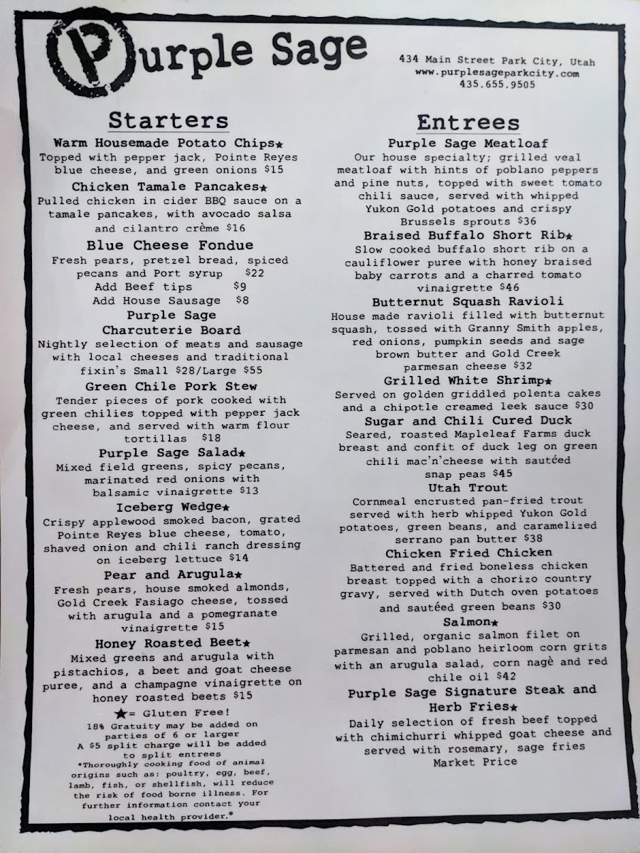 Welcome to Purple Sage, a culinary gem located at 434 Main St, Park City, UT. This vibrant eatery offers a delightful menu that highlights the fusion of comfort and creativity. The moment you step in, the warm ambiance wraps around you, creating a perfect backdrop for enjoying their exceptional dishes.